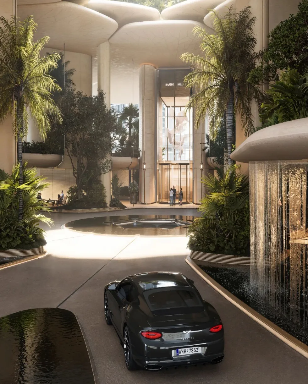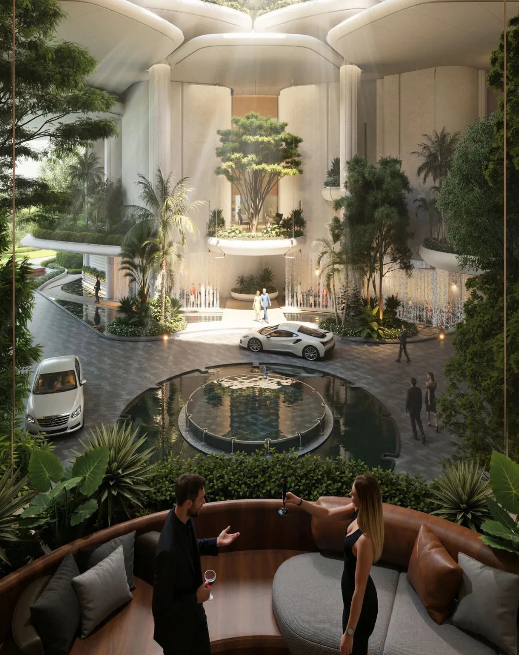 整个设计方案弱化了装饰主义,强化了空间与场景的表达,以石材巨柱构建建筑骨架,竖向收束与横向层叠相结合,既呼应了高密度城市对松弛感的需求,又打造出一个可生长、动静相宜的完整生态系统,完美诠释了安系“内心归隐”的顶豪定位。