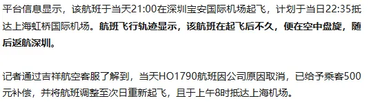 4月14日,有网友发帖称,吉祥航空一架由深圳飞上海的航班飞到一半,因故障返航深圳,且获得了500元补偿。