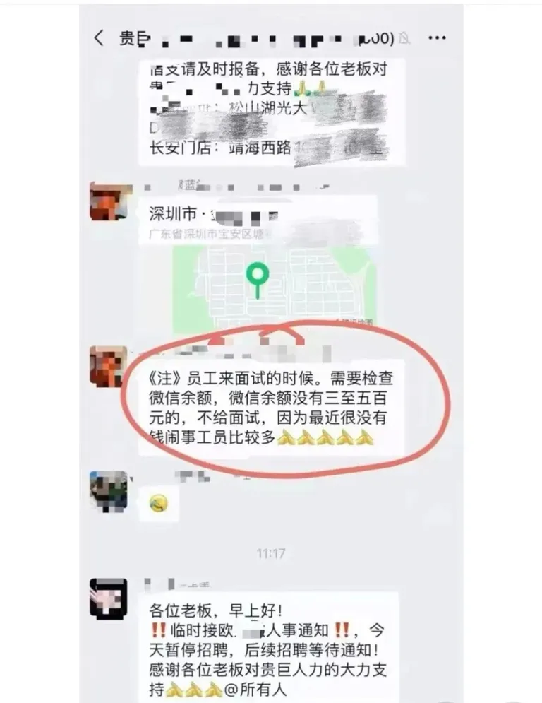 近日,一段提及“微信余额没有300至500元的不给面试”的聊天记录引发关注。