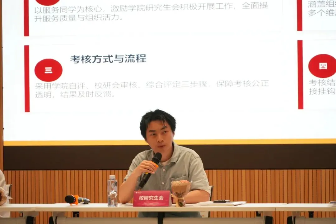 校研究生会主席团成员陈治汉围绕《深圳大学学院(部)研究生会考核细则》进行系统解读。在解读中,他重点阐述了方案所构建的六个核心评估方向,涵盖团队架构、制度标准、运作流程、思想建设、沟通效能和同学服务,并就每个方向的评分指标、材料格式及落实步骤作出了具体说明。