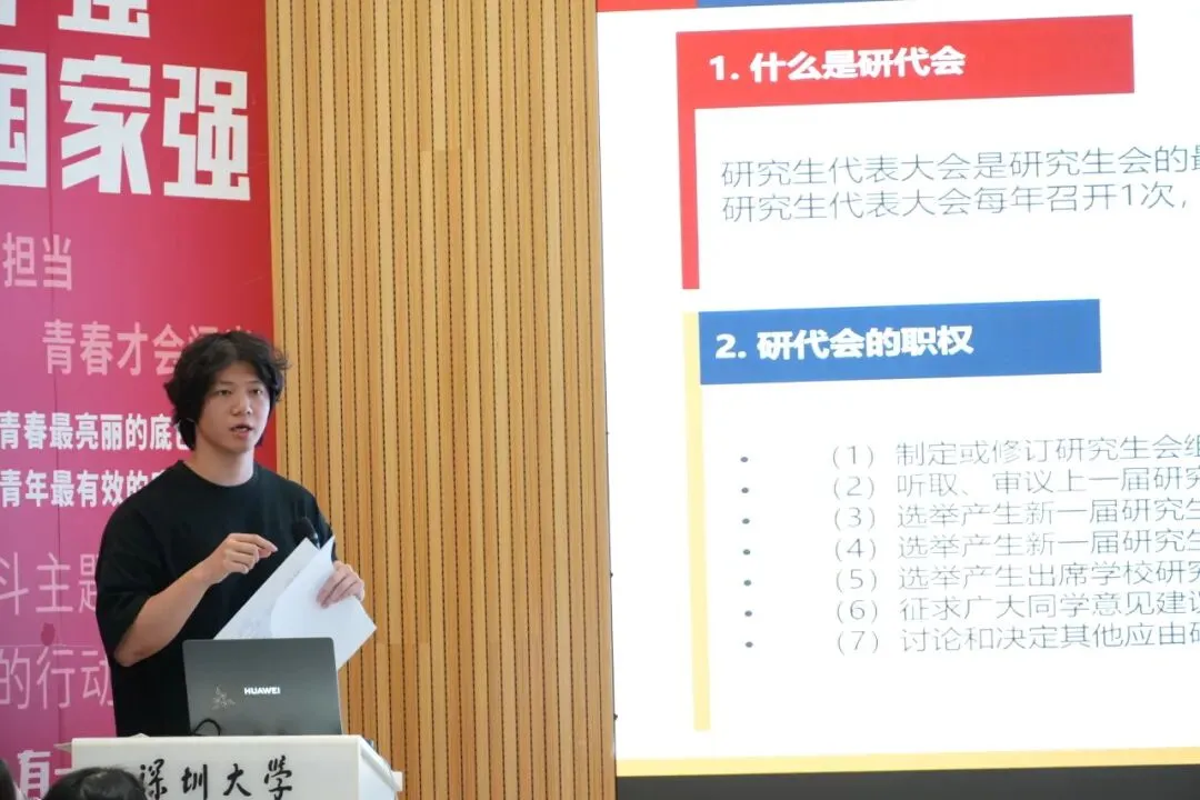 校研会综合联络部总干事黄展鹏首先明确了研究生代表大会的基本定位,并着重阐述了其在研究生群体参与民主管理与监督中的关键意义。随后,他以“全流程规范化操作”为脉络,系统讲解了从前期筹备、代表选举到后续总结报告等各个环节的具体步骤,并详细介绍了与之配套的标准文书模板,旨在协助各学院(部)规范、高效地组织召开研究生代表大会。此外,他也指出,大会不仅是会议流程,更是广泛听取同学心声、收集对研会工作建议的宝贵契机,这将有力推动研会工作流程的持续优化与服务质量的不断提升。
