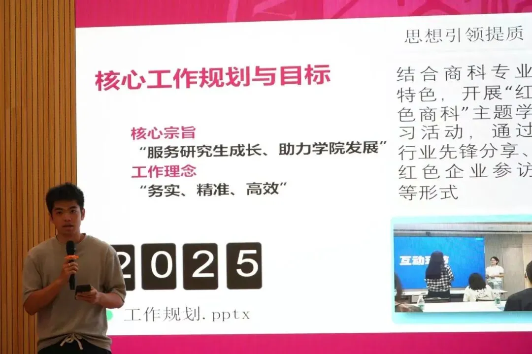 校研会主席团成员陈治汉首先介绍了本学年校研究生会的工作部署与校院联动的核心方向。随后,来自全校24个学院(部)的研会主席团代表逐一发言,在简要介绍自身情况后,重点展示了可供合作的特色项目,并普遍表达了对加强校院、院院之间协同合作的积极意愿与热切期待。
