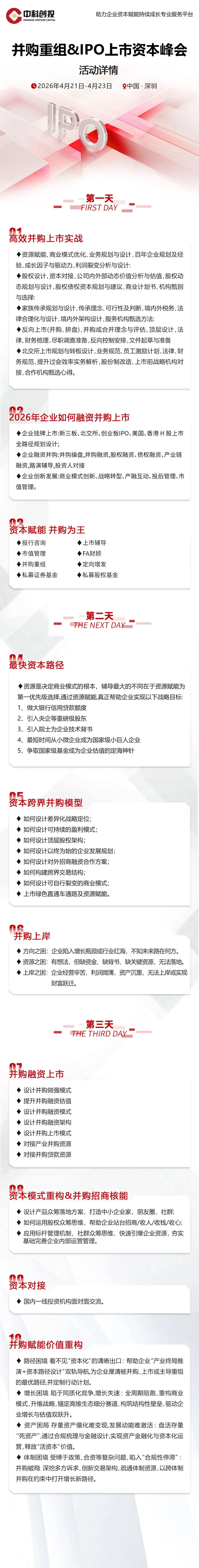 4月21-23日·深圳站,中科商业蝉联各大知名投资机构,共同打造了一场三天《企业家资本赋能–资本对接峰会》活动,会议活动期间,我们邀请了各行业高端龙头企业家相聚现场,互通资源,互谈融资、并购方法、上市路径、互探经商技巧,共谋发展。 本次活动主要针对企业有上市融资,股权融资,债权融资、企业并购、被并购、股权激励、顶层设计、估值提升、市值管理、上市辅导、企业转型升级、战略定位、产业链整合、IPO上市路径规划、商业模式升级、二代接班、企业股改、财税规范、业绩增长、盈利提升、渠道拓展、出海破局、招商引资、品牌打造、营销推广、资源整合等需求的企业家们,提供全程陪跑服务。在现场你可与资本大咖深度交流学习,分享企业当下遇到的困难,获得解决困境的方法;与众多细分领域高端龙头企业家,互通资源,沟通经商之道;与投资机构介绍产品和项目,了解机构和投资人喜好,学习融资、并购、上市技巧。