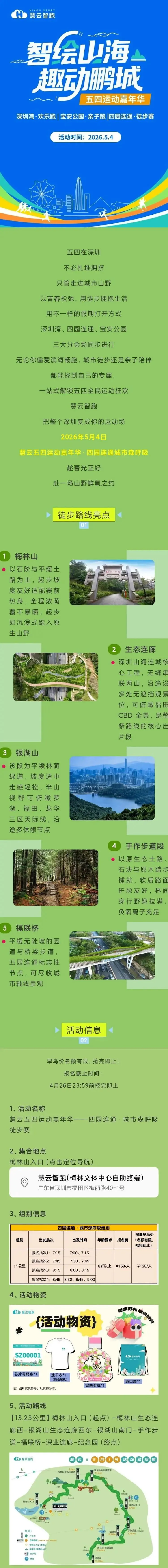 2026慧云五四运动嘉年华·四园连通城市森呼吸定于5月4日在深圳梅林山入口出发,13公里个人赛,分7:15、7:45、8:15、8:45四批出发;先报先得,额满即止!4月26日前报名享受早鸟价!