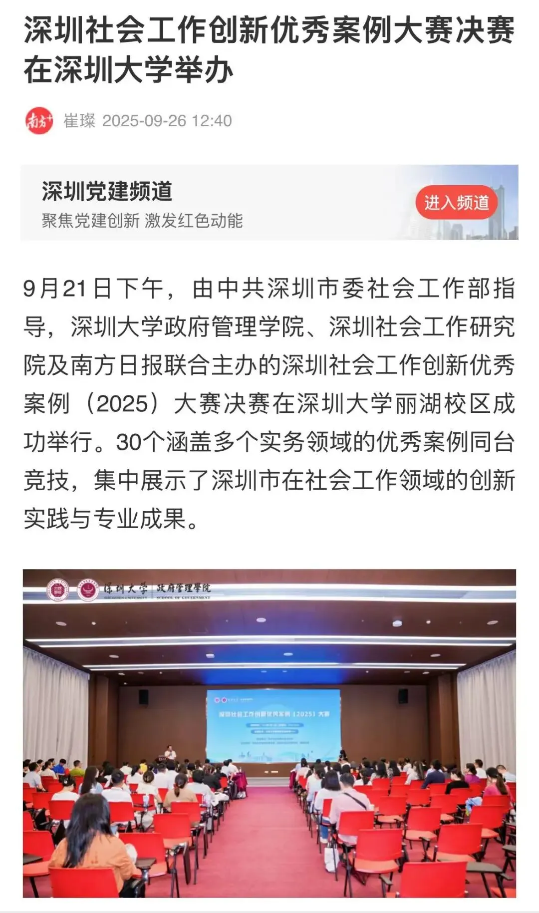 2025年9月21日下午,由中共深圳市委社会工作部指导,深圳大学政府管理学院、深圳社会工作研究院与南方日报联合主办的深圳社会工作创新优秀案例(2025)大赛决赛,在深圳大学丽湖校区启明楼C101顺利举行。