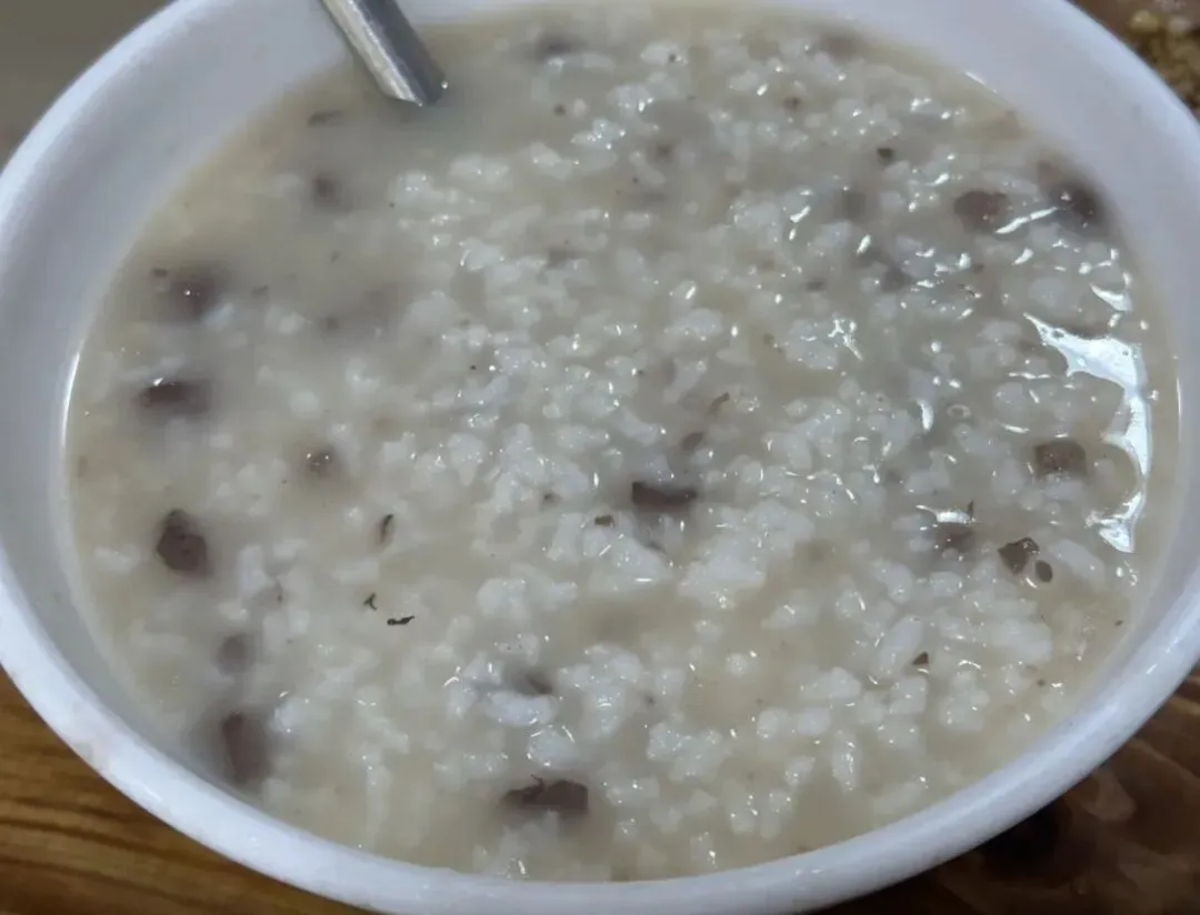 他们家的粥和饭是免费的,可以无限续。鸭粥是用鸭汤和鸭红熬煮的,粥里还有鸭肉碎,难得的是没有腥味,喝起来很鲜甜,加上鸭血入口顺滑,因为没吃饭,我连喝了两碗。