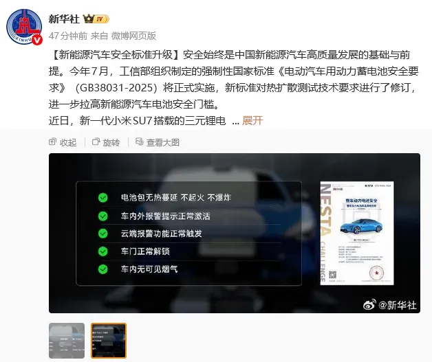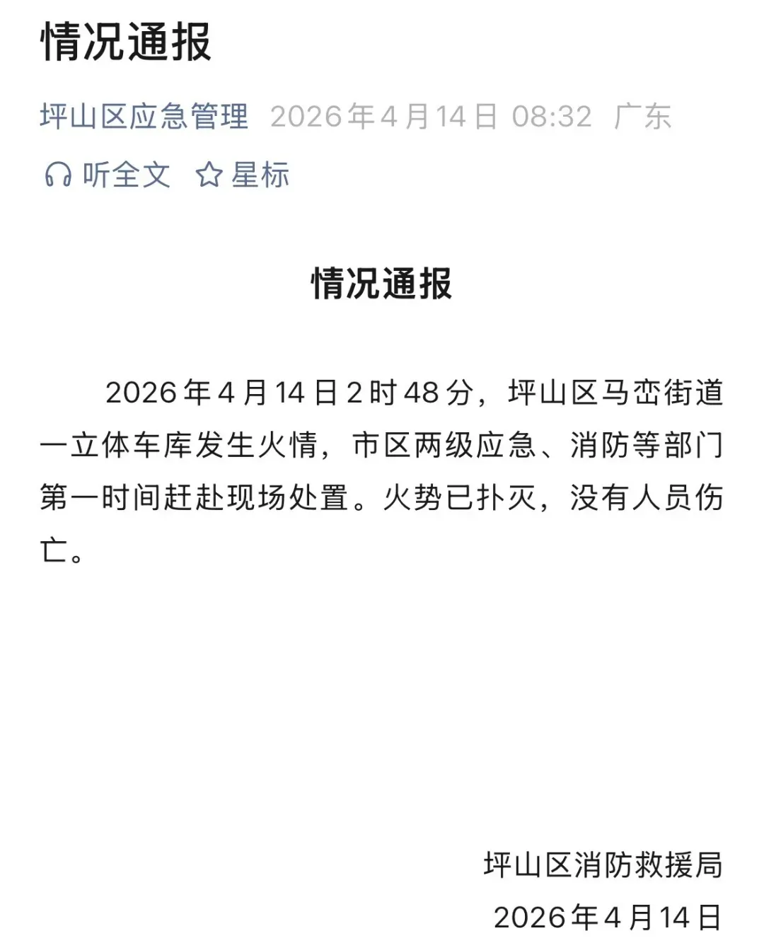 此前,深圳坪山区消防救援局发文称:2026年4月14日2时48分,坪山区马峦街道一立体车库发生火情,市区两级应急、消防等部门第一时间赶赴现场处置。火势已扑灭,没有人员伤亡。今年7月,工信部组织制定的强制性国家标准《电动汽车用动力蓄电池安全要求》(GB38031-2025)将正式实施,新标准对热扩散测试技术要求进行了修订,进一步拉高新能源汽车电池安全门槛。 【版权声明】本公众号转载的网络等媒体文章只为让更多朋友分享,如相关著作权人不同意转发请于后台留言