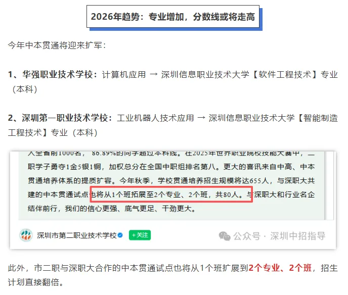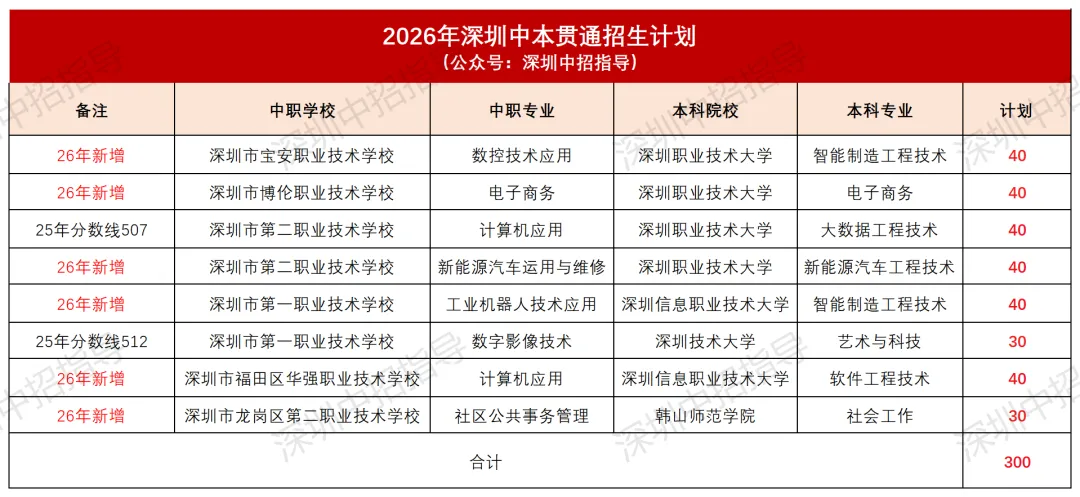 深圳共6所中职、8个专业有中本贯通资格,招生合计300人。