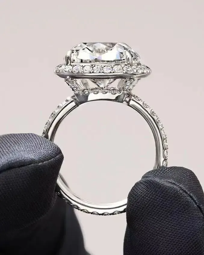 在天然钻石时代,这种Halo围镶款可以通过小克拉主钻+一圈配钻的形式,让整个钻面瞬间扩大。但在培育钻时代,主钻已经可以1克拉起跳了。现在这种1克拉主钻+10K白金边框的设计,可以让整个钻面,达到3克拉单颗主钻的效果,非常酷炫。
