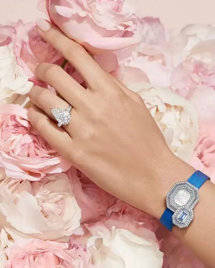Belle的最大特色是设计思路来自古董珠宝,所以有一种明显的复古优雅感。看似是一朵钻石玫瑰,实则花瓣是方中带圆,四角尖尖的钻石花框。