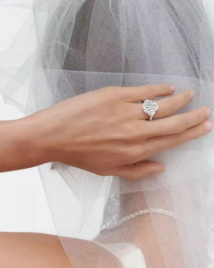 比如,曾经在苏富比拍卖出50万人民币的祖母绿切割的祖母绿单钻Promise,配钻就是两颗加一起达到1.5克拉的梯形配钻。