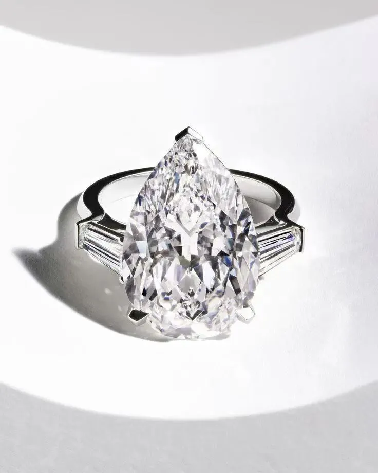 其中,祖母绿切割的单颗主钻,就会配两颗梯形切割衬石;而梨型切割的单颗主钻,就会配梨型切割的配钻。这些异性切割的配钻克拉数往往不菲。