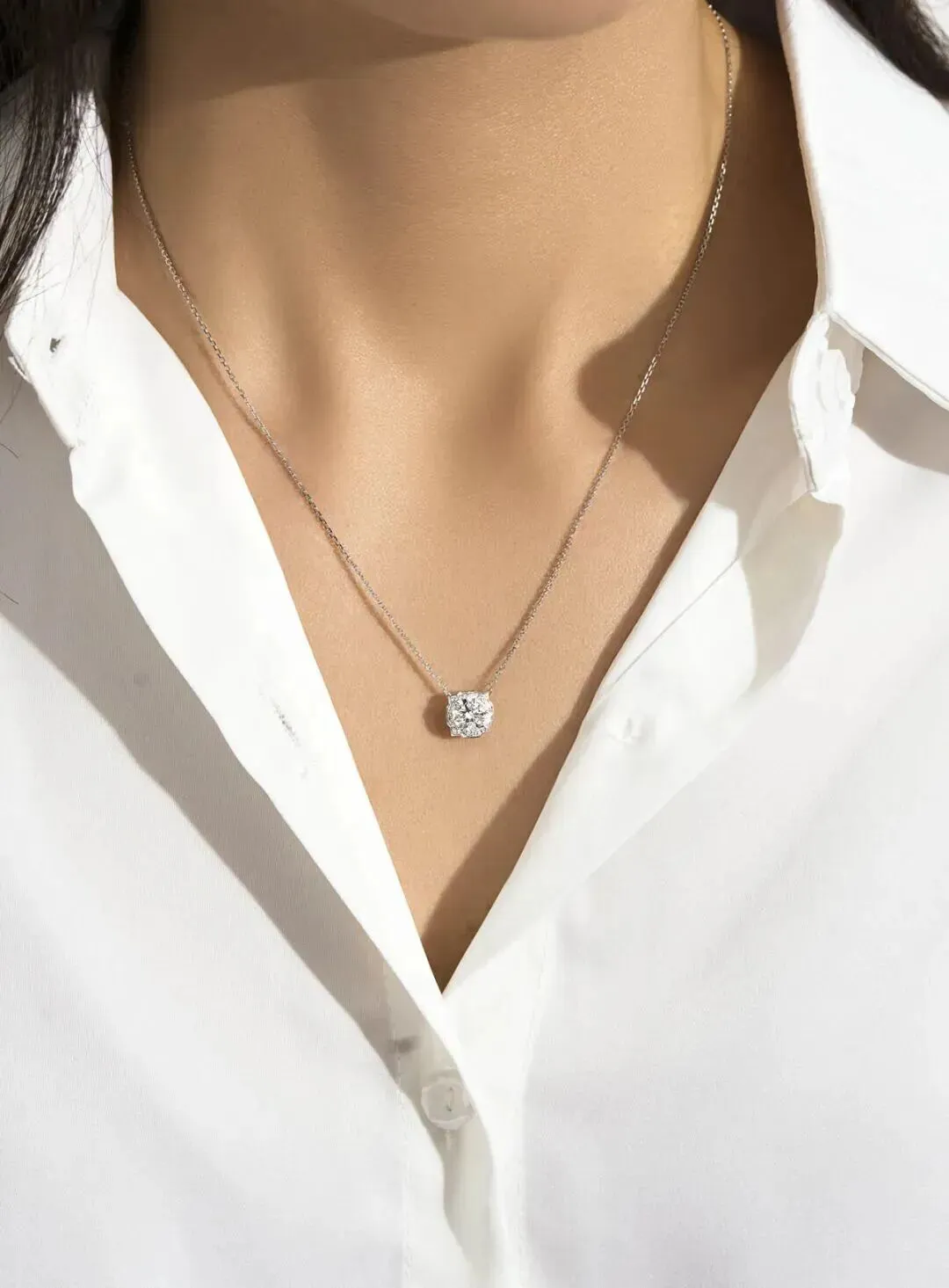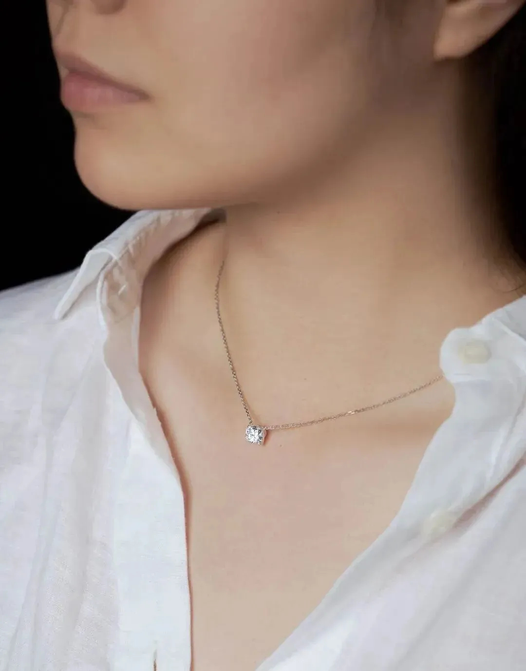 这款钻石吊坠项链,10K金链有两个挂扣位置,可以选择两种佩戴长度,此图为长款