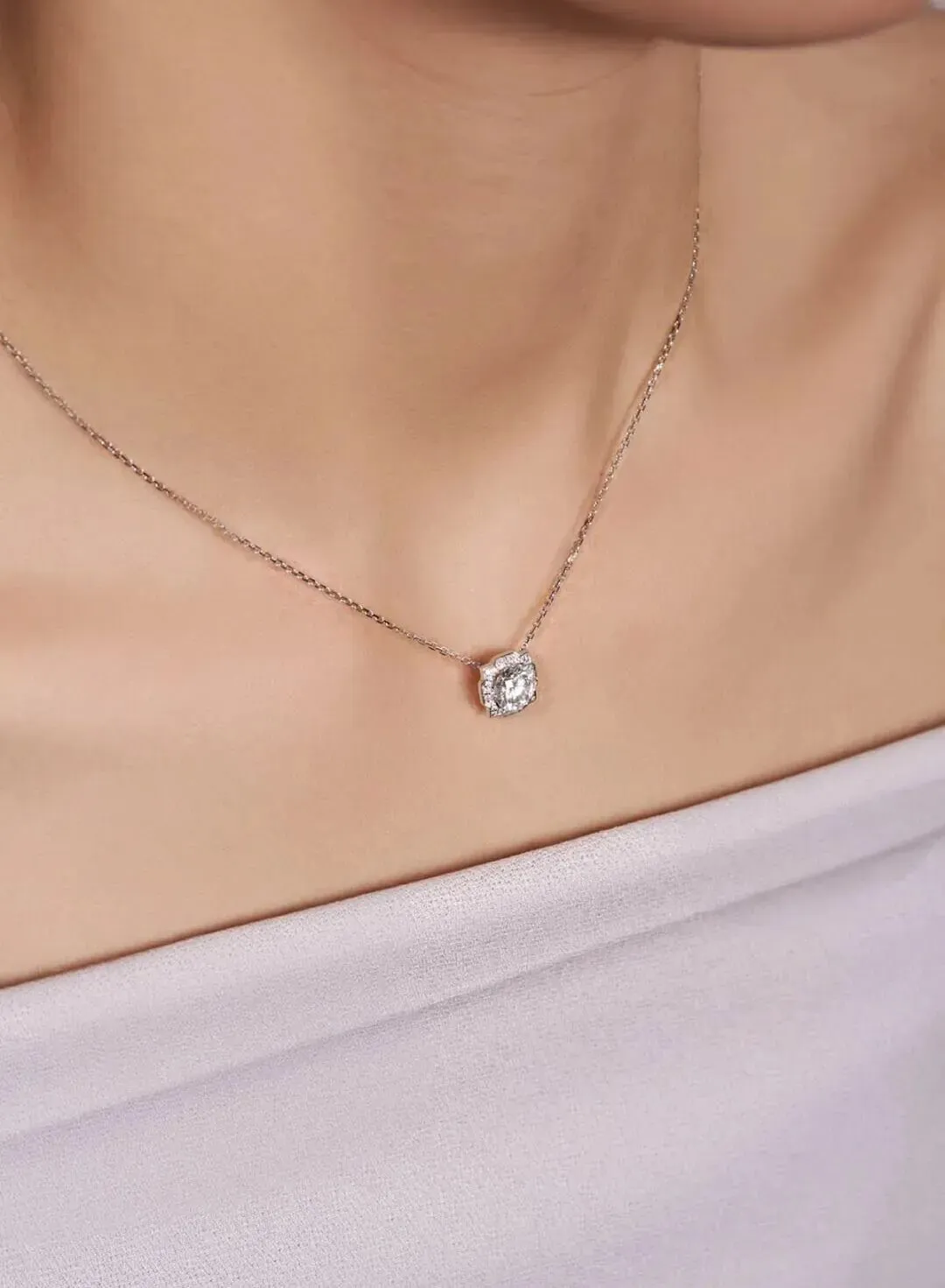 这款吊坠项链的镶嵌工艺有别于传统做法,尽可能把钻石裸露出来,不用碎钻衬托。这也是培育钻把钻石价格打下来之后,一种奢侈豪横的做法。所选用的培育钻石1克拉,有IGI证书,都是最好的VVS级D色。