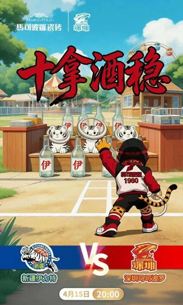 北京时间4月15日,深圳男篮在与新疆飞虎的赛前发布一张“十拿酒稳”主题海报,直接将新疆队吉祥物和伊力特酒瓶设计成套圈目标,挑衅意味拉满。此举迅速引发新疆球迷强烈不满,多个球迷平台吐槽声一片。