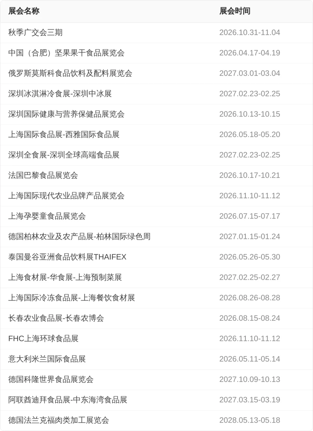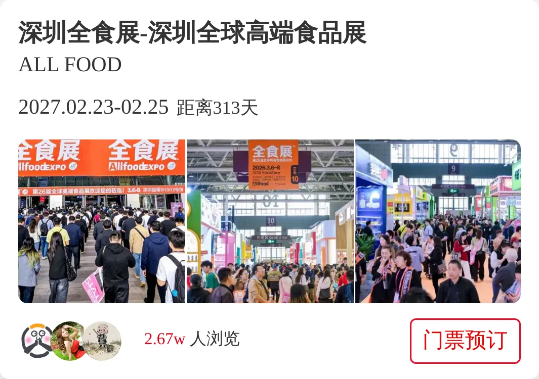 为了更好地推动行业发展,第28届全球高端食品展览会(全食展)已定档2027年2月23-25日,在深圳国际会展中心(宝安)举行。黄金展位火热预定中!想了解更多展会信息,请联系聚展~