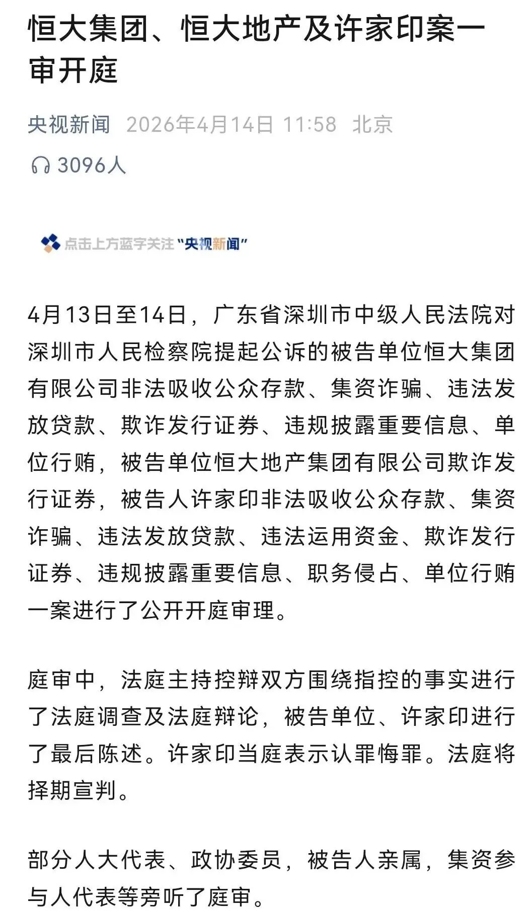 老诌刷到这个新闻:许家印在深圳法院受审,认罪了。
