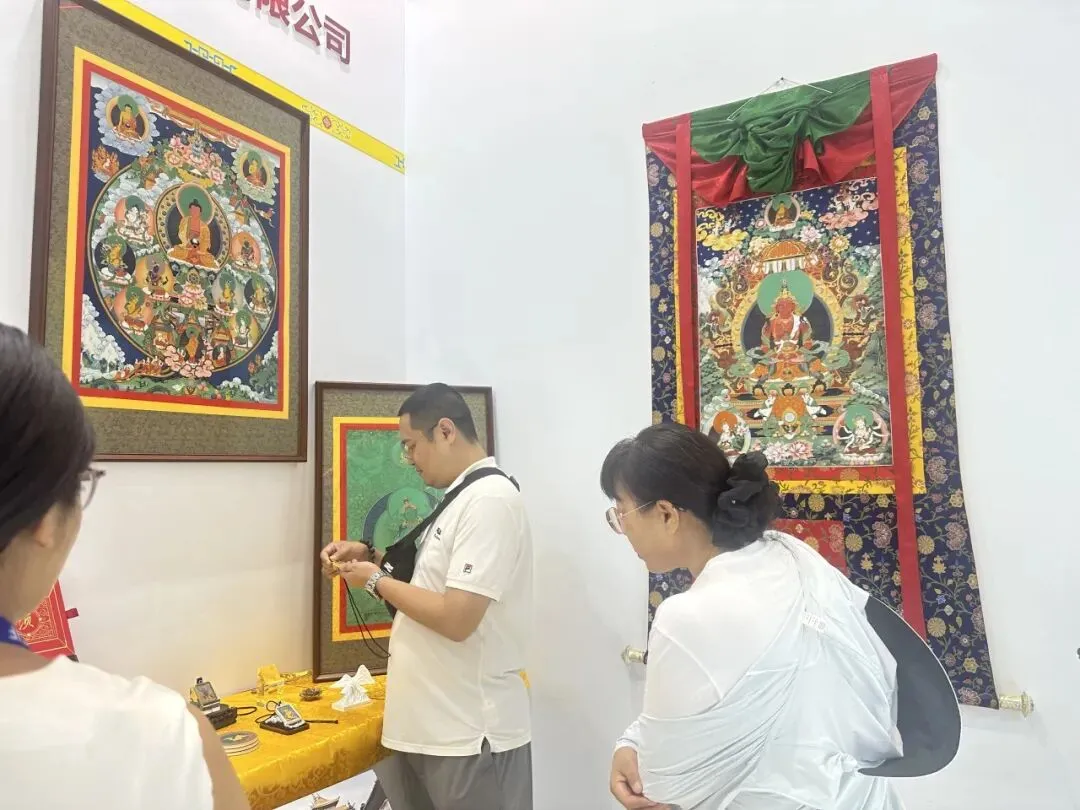 文博会上寓意福寿吉祥的长寿三尊、寓意救人脱离灾难的绿度母、寓意财富的聚集和好运的黄财神等唐卡深受参观者喜爱。