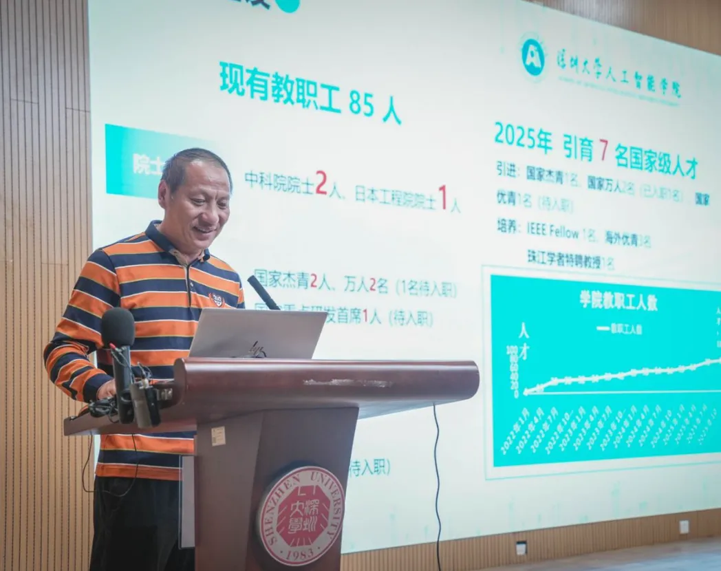 人工智能学院副院长沈琳琳介绍了学院师资与智算中心建设的突破性进展。2025 年引育国家级人才 7 名,现有教职工 85 人,汇聚中科院院士 2 人、日本工程院院士 1 人、IEEE Fellow 1 人等顶尖人才,形成结构合理、实力雄厚的师资梯队。