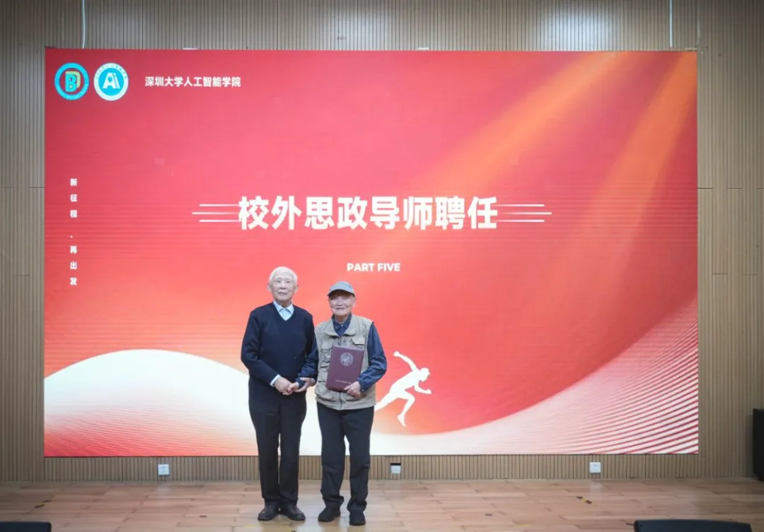 大会特别举行校外思政导师聘任仪式。学院诚挚聘任孙熙涛先生为校外思政导师,由陈国良院士为其郑重颁发聘书。孙熙涛先生是一位令人敬仰的抗美援朝老兵,退休后一直心系教育事业,自愿额外交纳党费25万元,并先后向深圳大学捐赠 24 万元,用以资助经济困难学生,尤其关注人工智能等国家急需的科技领域的人才培养。