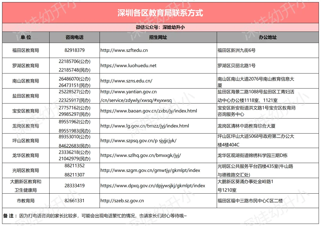 深圳十区目前都实行网上报名公办民办的报名入口也是不一样的,给大家整理了各区教育网站及咨询电话,以及网报网址,记得收藏哦~