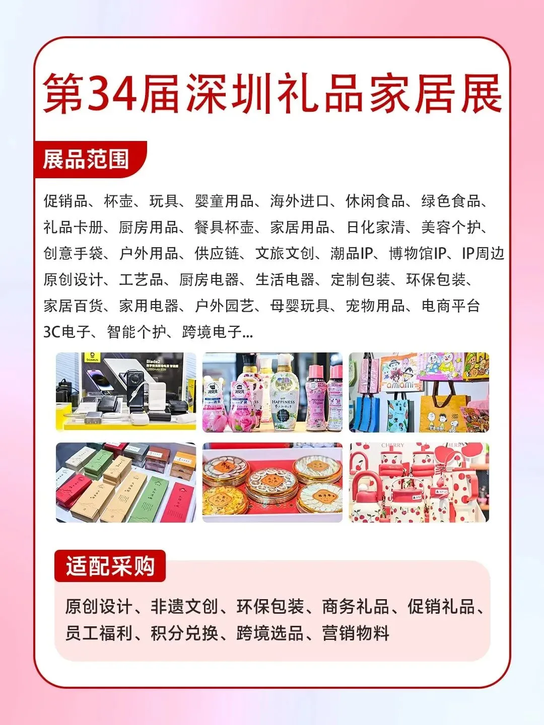 2026深圳礼品家居展(4.25–28)在深圳国际会展中心(宝安)举办,展区覆盖智能家电、家居日用、时尚餐厨、文创IP、食品酒饮等品类。