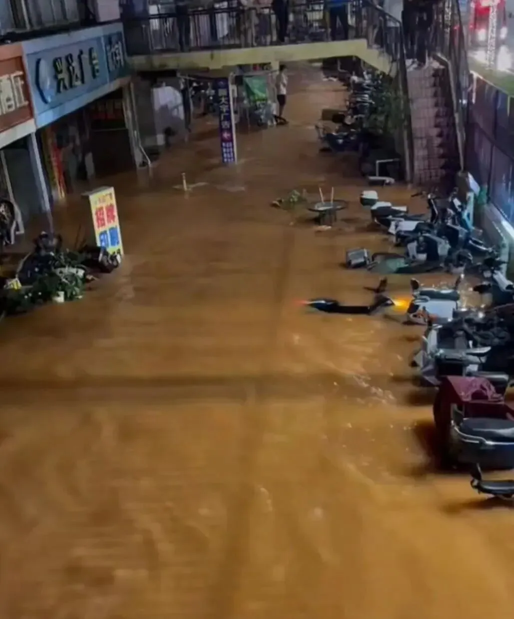 ·多个一楼商铺被淹,部分店铺水深达20厘米。