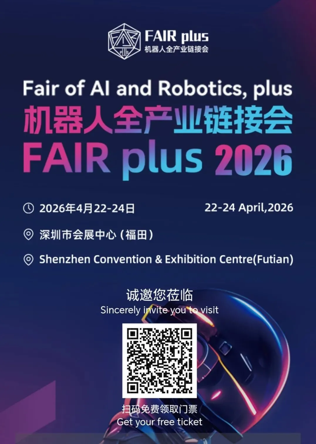 2026年4月22日-24日,由深圳市机器人协会发起举办的FAIR plus机器人全产业链接会将在深圳会展中心(福田)9号馆隆重启幕。