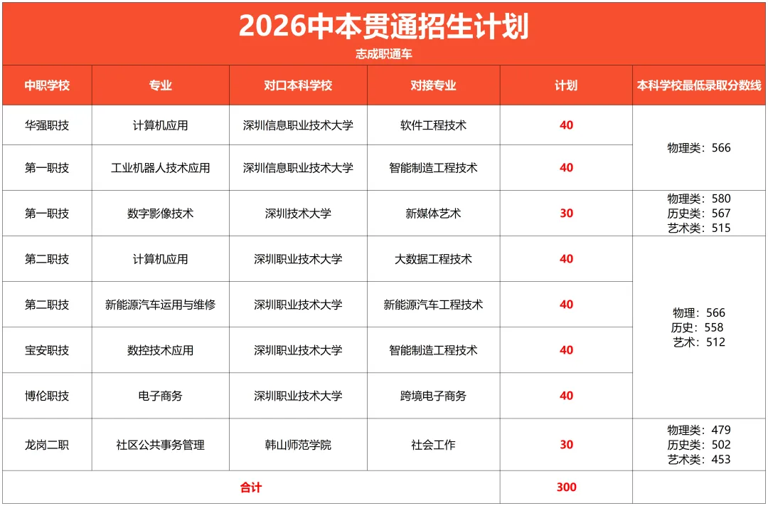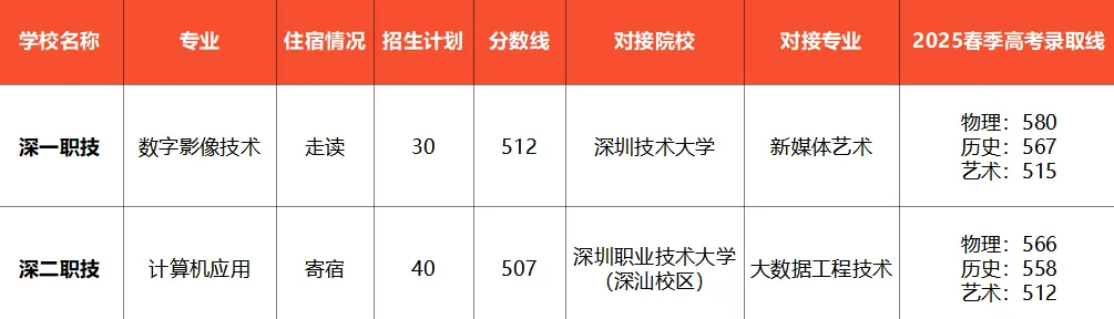 在2025年,中本贯通仅有两所学校两个专业,共招生70人,,深一职数字影像技术→深技大新媒体艺术、深二职计算机应用→深职大大数据工程技术,25年首届招生分数线分别为512分、507分,其他专业均为26年新增。