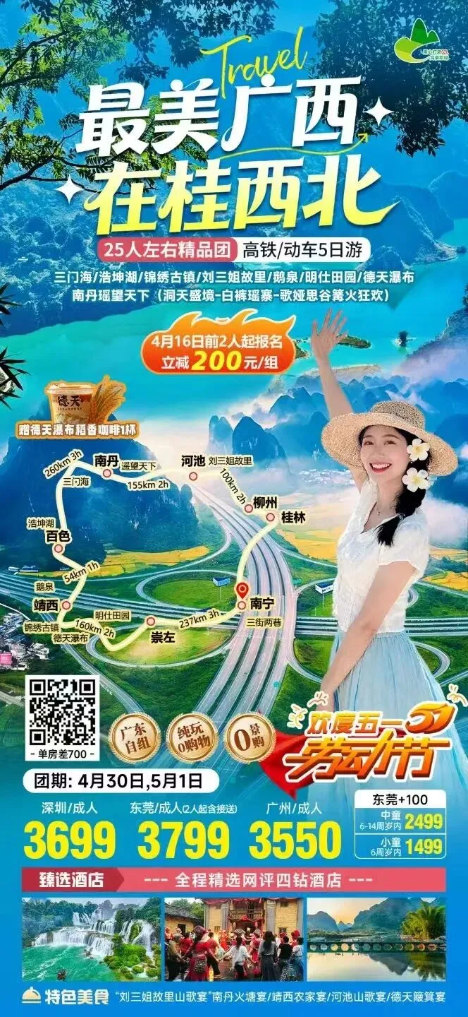 五一假期深圳动车到桂西北跟团5天旅游团3699,三门海/浩坤湖/锦绣古镇/刘三姐故里/鹅泉/明仕田园/德天瀑布/南丹瑶望天下/白裤瑶寨篝火