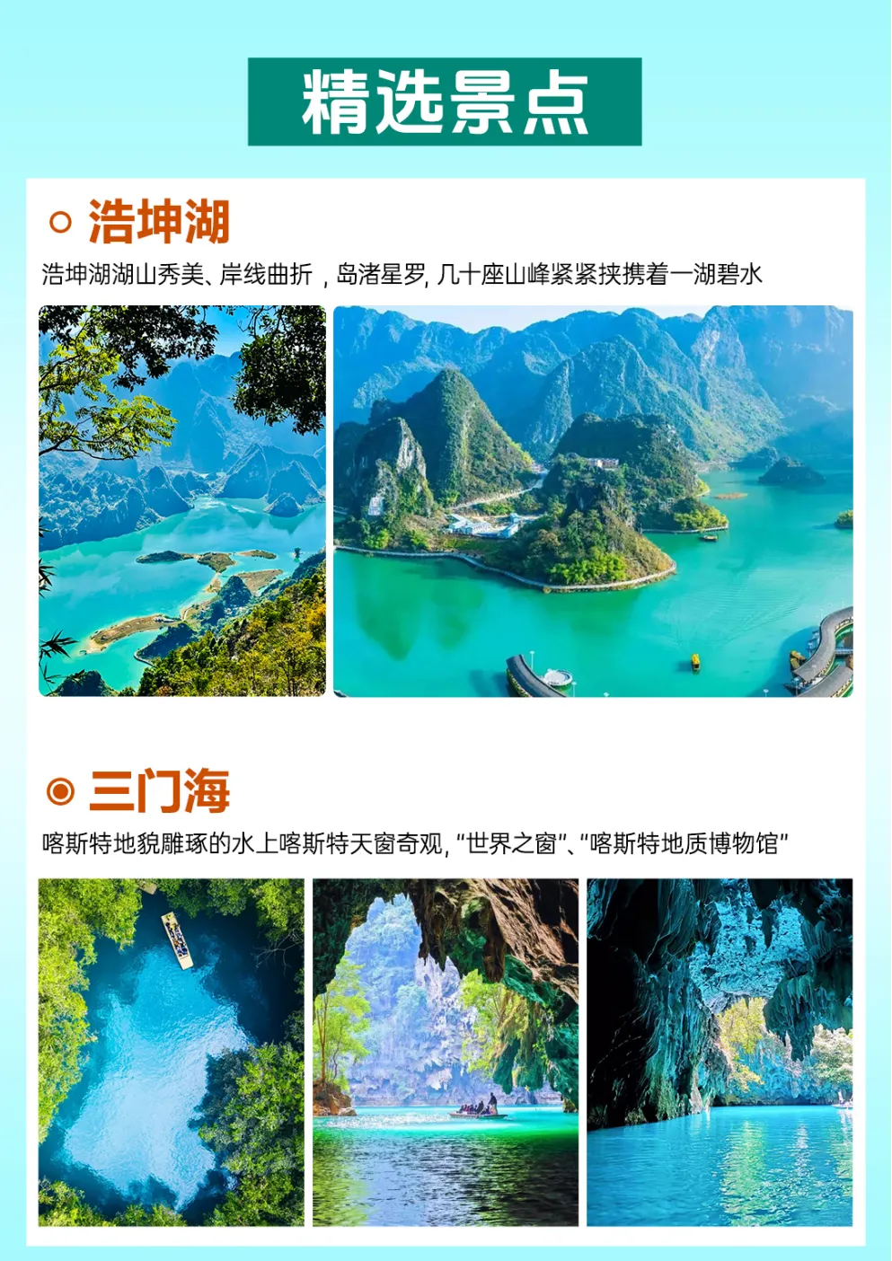 13:00【浩坤湖景区】(含游船,游览时间约2 小时)浩坤湖古称“东湖”,湖光山色处处 成美景 ,古代多少文人墨客畅游浩坤湖, 留下“浩坤湖水碧连天 ,倒影青峰花竹烟。一叶扁舟君自去 ,桃花源里觅 陶潜”的千古佳句, 明代土司岑云汉在汾洲钓鱼台附近的石壁上雕刻的《游东湖记》 ,得到流传。 浩坤湖一年四季 绿莹莹 ,深不见底 ,湖中几个小岛像竖起的吊坠一样镶嵌在一颗硕大的绿宝石里。湖边上的山峰层峦叠嶂 ,气势雄 伟地袝托着明如境的湖面 ,浑然天成 ,如同走进了梦幻般的仙境。