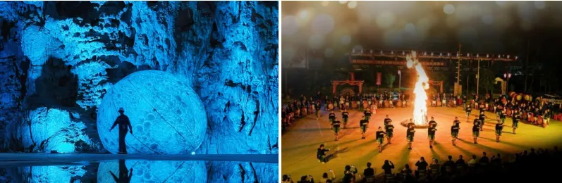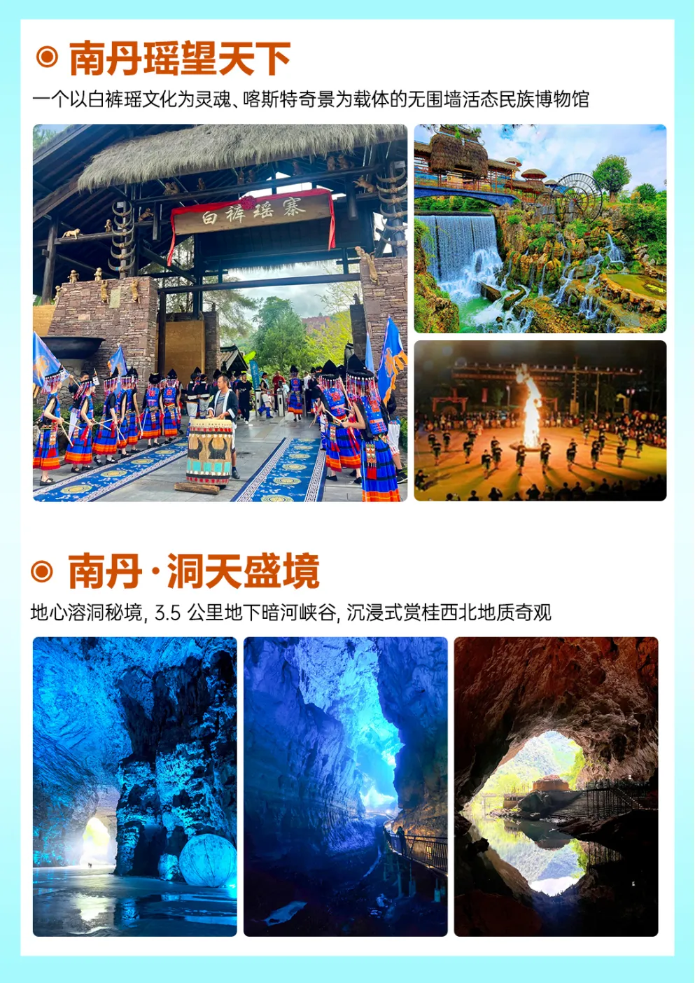 14:00南丹瑶望天下(洞天盛境-歌娅思谷篝火狂欢,含首道门票)。是国家4A 级景区,位于广西河池市南丹县里湖瑶族乡王尚屯,是一个以白裤瑶文化为灵魂、喀斯特奇景为载体的无围墙活态民族博物馆;由歌娅思谷、洞天盛境、白裤瑶寨三大核心片区,及美烈巴堡、瑶里古墓群等景点组成,主打瑶族历史展示、白裤瑶民俗体验与地下峡谷溶洞探秘。