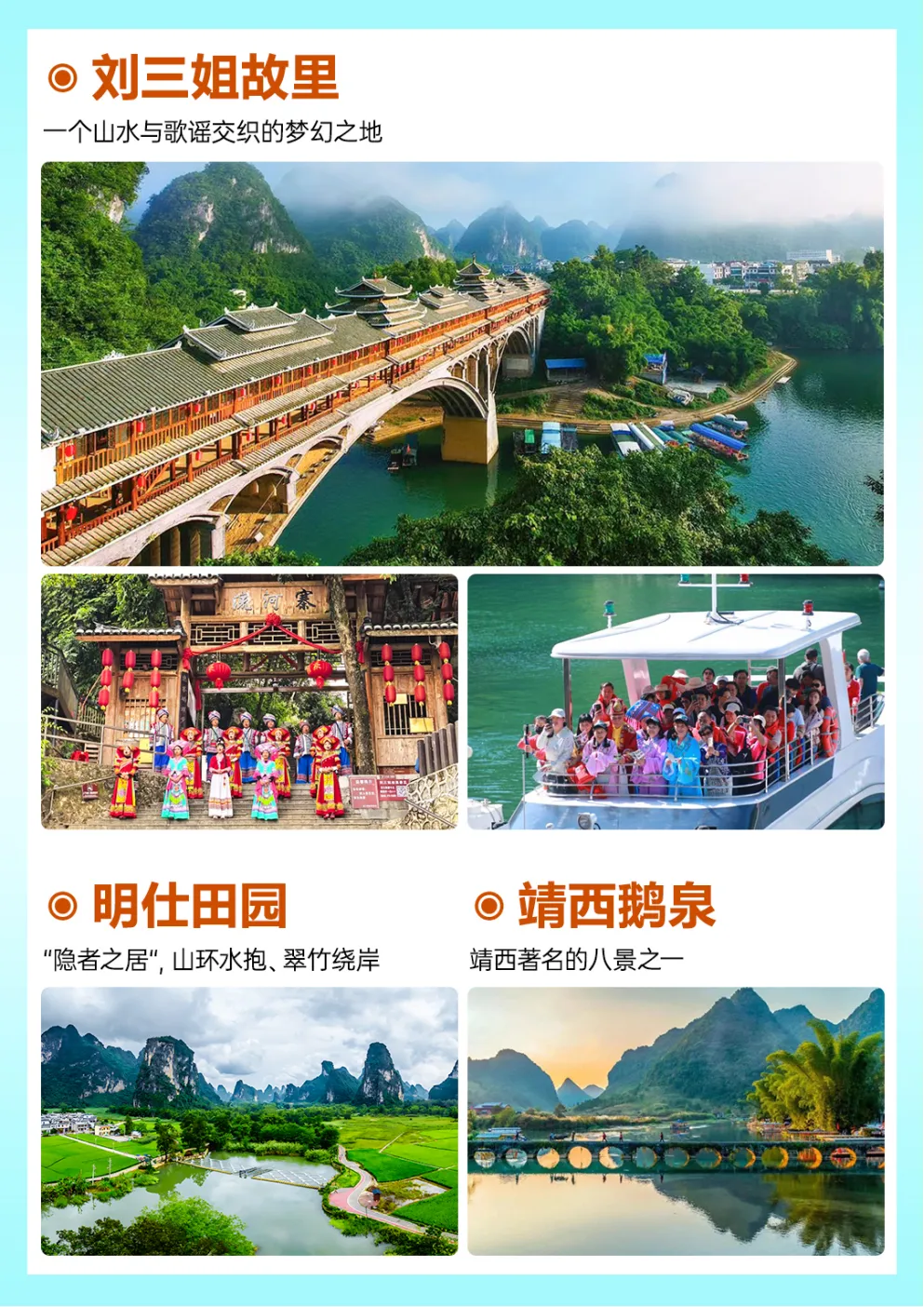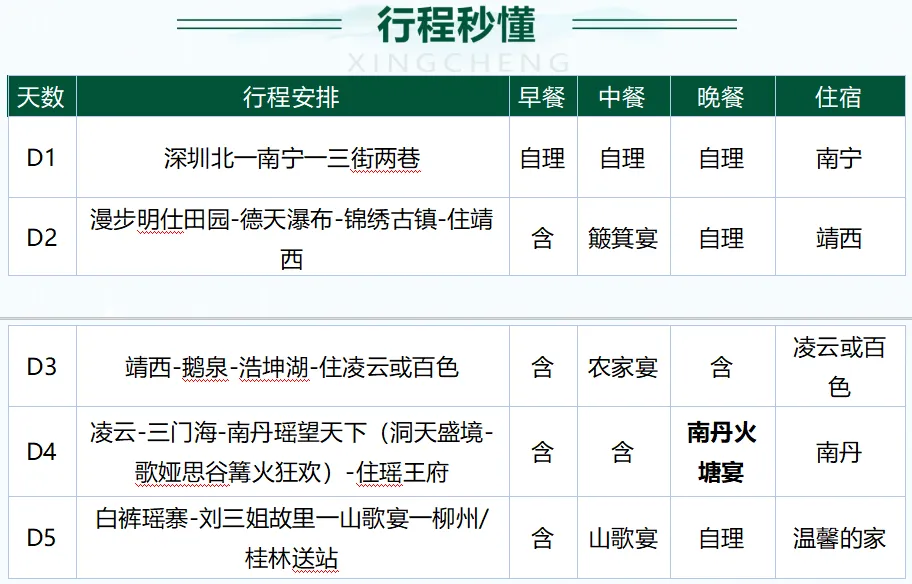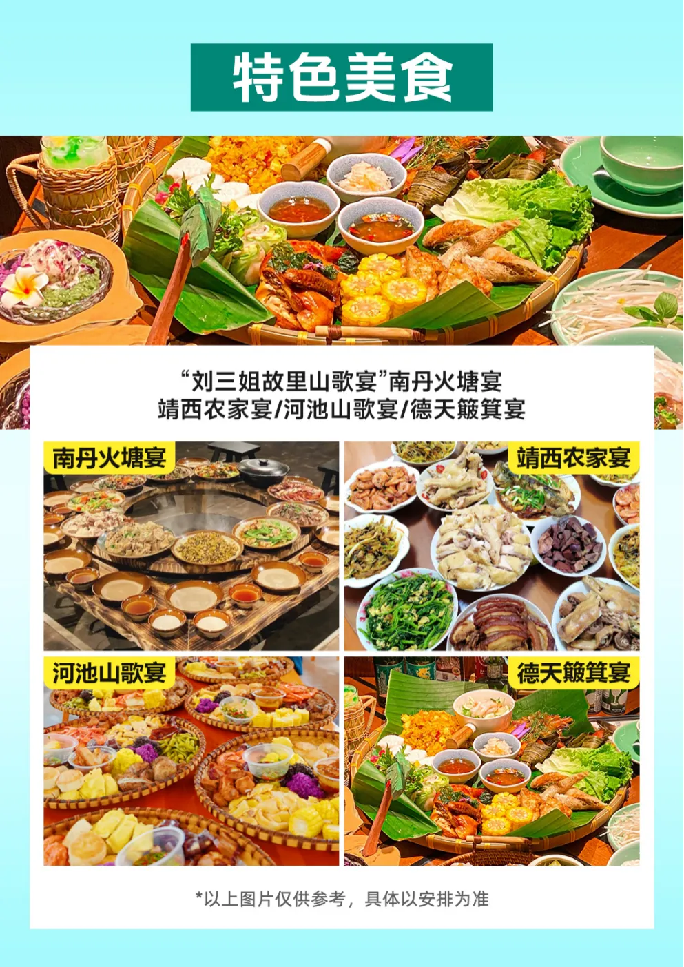 ⭐特色美食:每天一个特色餐,“刘三姐故里山歌宴”南丹火塘宴/靖西农家宴/河池山歌宴/德天簸箕宴;