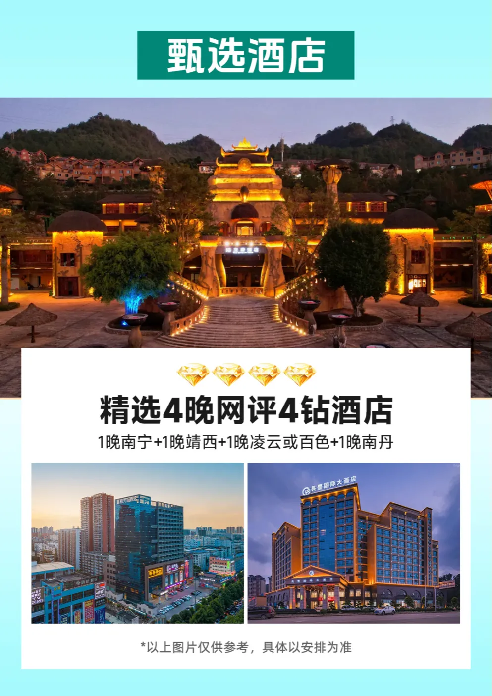 1.大交通:深圳/广州-南宁,柳州/桂林-深圳/广州,往返二等座高铁/动车票2.住宿:全程精选网评四钻酒店,双人标间,若产生单男单女客人自补房差。