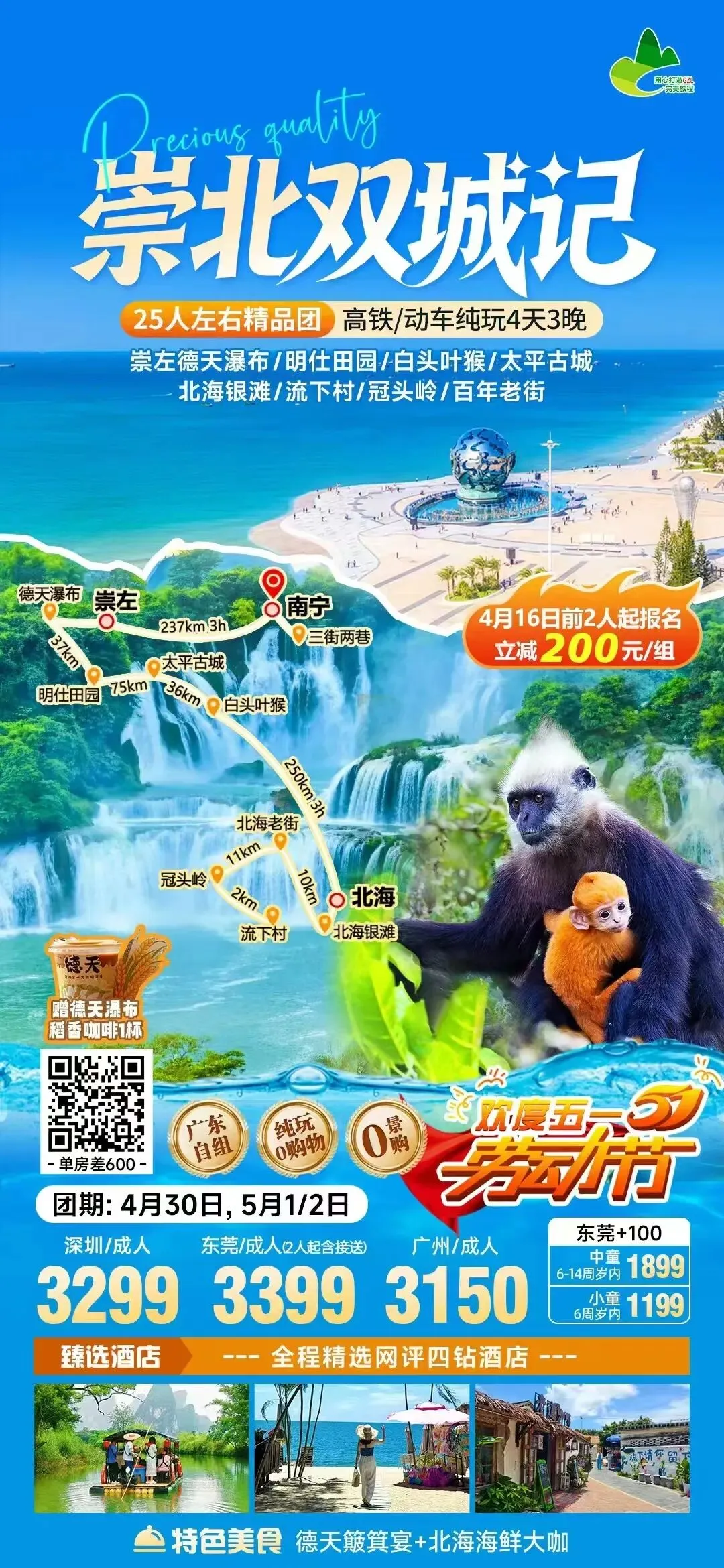五一假期深圳动车到崇北双城跟团4天旅游团3299,崇左德天瀑布/明仕田园/白头叶猴/太平古城北海银滩/流下村/冠头岭/百年老街