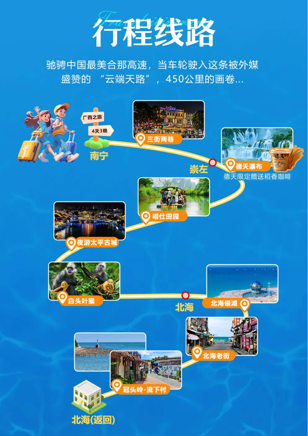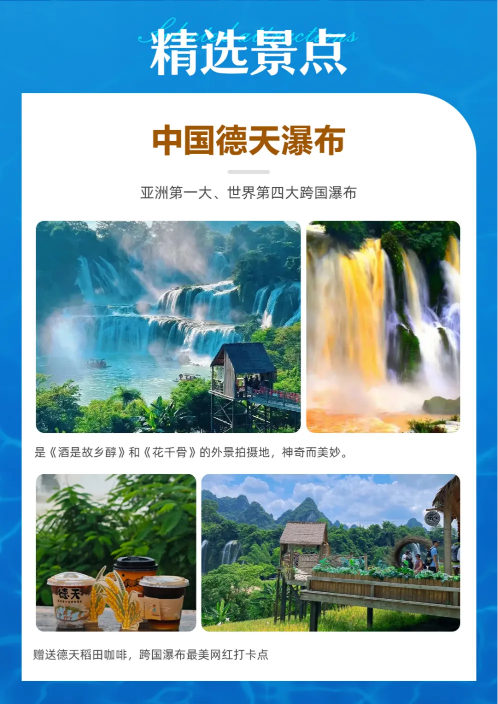 行程亮点:德天跨国瀑布、明仕田园竹筏、探寻喀斯特石山精灵、北海银滩,四重惊喜,玩透边境独特风情!