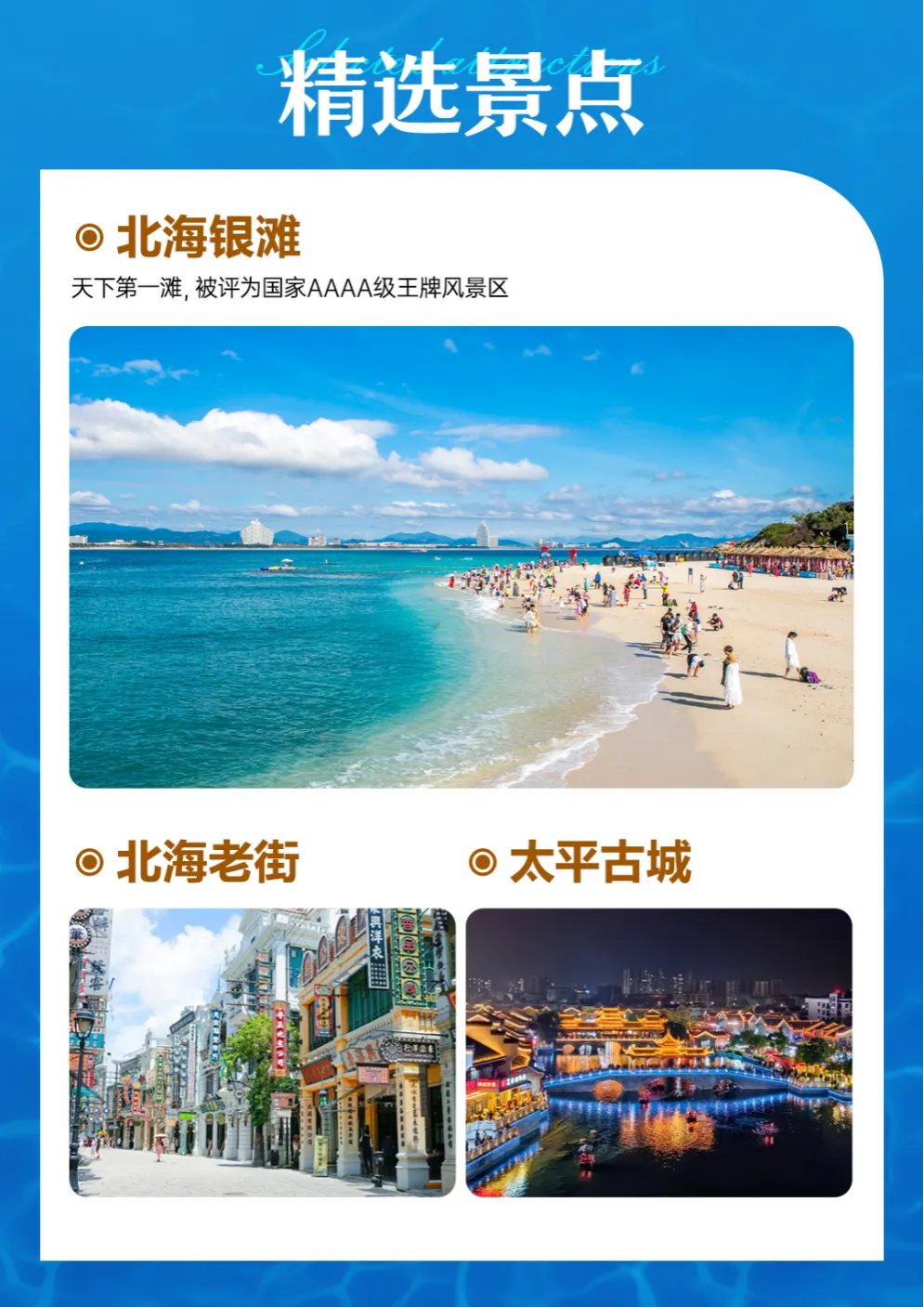 游览【北海老街】(游览时间约30分钟)北海老街历史悠久,已有200多年历史,清朝时期就开始,硬是把中西方建筑风格完美融合,那叫一个优雅。珠海路和中山路,就像两条城市的脊梁,横跨一个半世纪,见证了无数繁荣与沧桑。晚上,您可自由闲逛【侨港风情街】,感受【老北海】的韵味,您可以在这里品尝到独具特色的越南风味小吃、北海特色海鲜粉、海鲜锅,还有几块钱就能买到一大碗的北海糖水,老街的熙熙攘攘,一直持续到凌晨一两点。第4天:北海银滩-北海返程