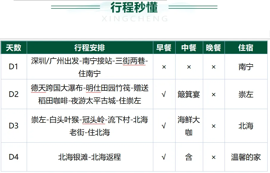 后结束返程,根据返程时间收拾好行李,结束愉快的广西之旅!(返回班次参考G2920/18:32-23:40北海-深圳直达班次或16点后广州南中转深圳北班次,具体班次以出票为准!)