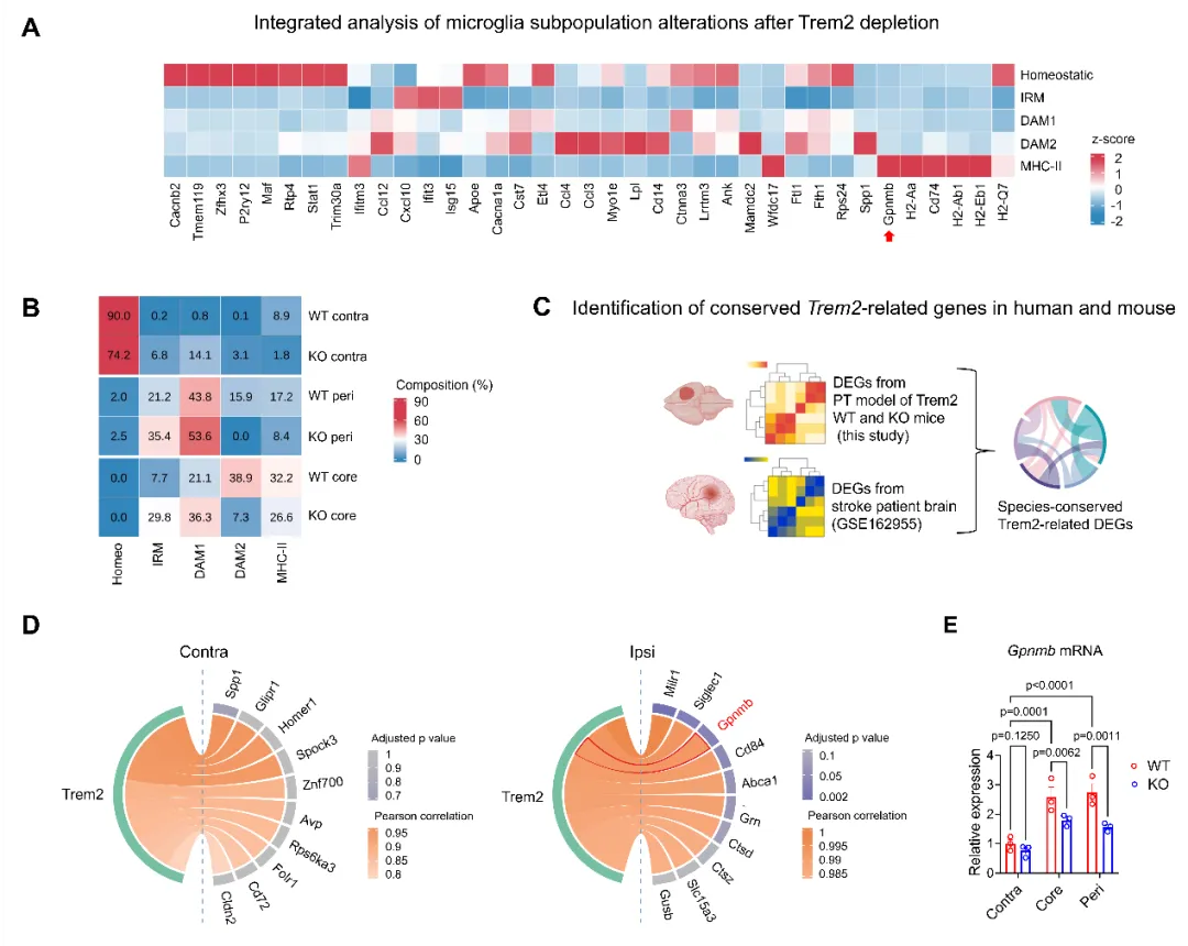 研究团队通过整合小鼠卒中模型与卒中患者的转录组数据,鉴定出糖蛋白Gpnmb为Trem2下游具有物种保守性的关键调控靶点。实验证实,颅内注射可溶性Gpnmb重组蛋白可抵消Trem2敲除所带来的神经保护效应。此外,临床样本的分析显示,卒中患者外周血中可溶性Trem2和Gpnmb的水平可有效预测疾病严重程度,具备作为卒中生物标志物的潜在应用价值。