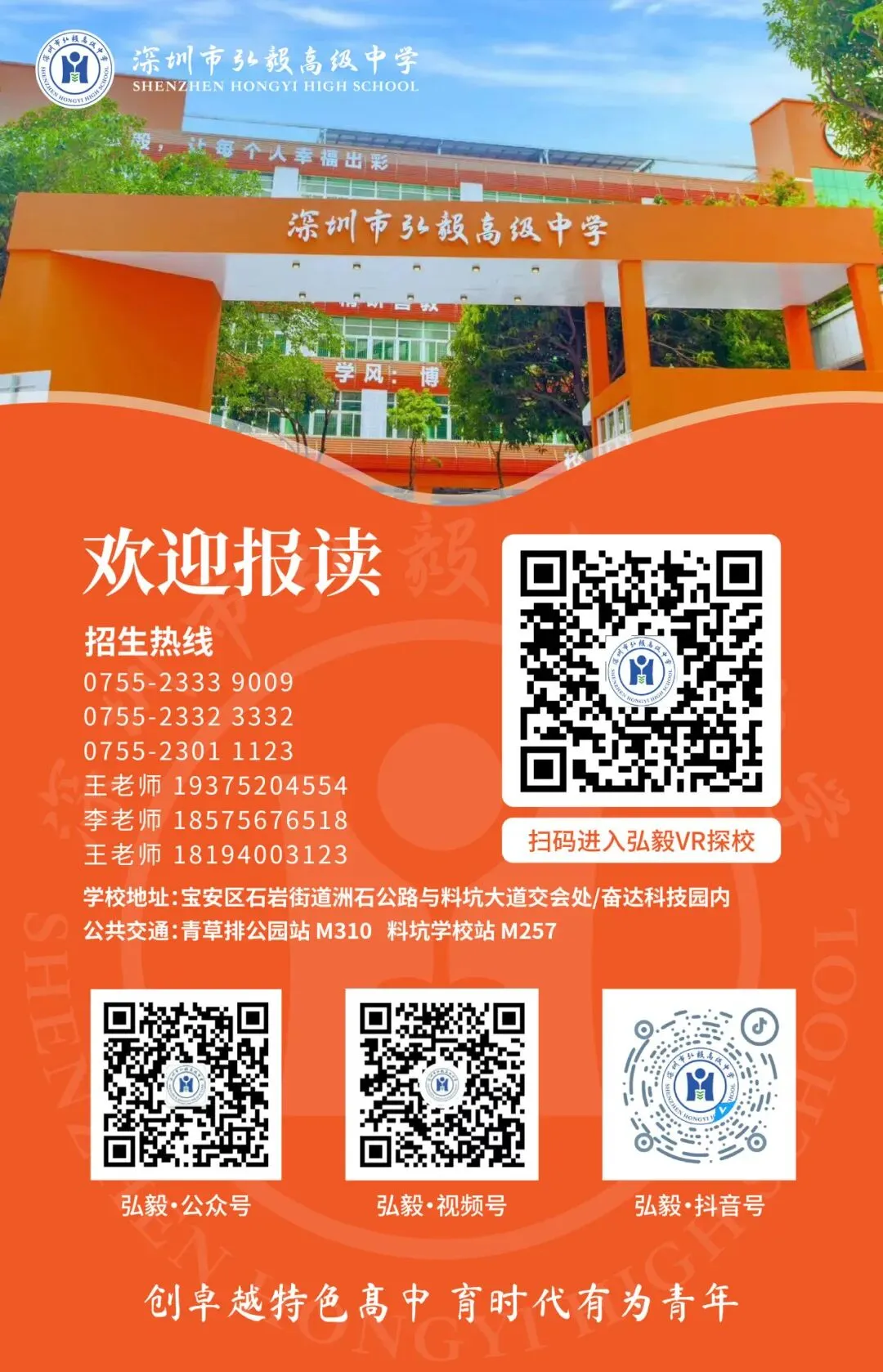 深圳市弘毅高级中学秉持“创办卓越特色高中,培育时代有为青年”的办学愿景,以“弘道·毅行”为校训,秉持“让每一个人幸福出彩”的办学理念,拥有一支教学经验丰富、专业素养过硬的师资队伍,他们在学科知识传授上精益求精。同时,学校积极面向全体学生开展各类文体活动、社团活动与社会实践,全方位培养学生综合能力与创新精神,为学生未来发展奠定坚实基础。