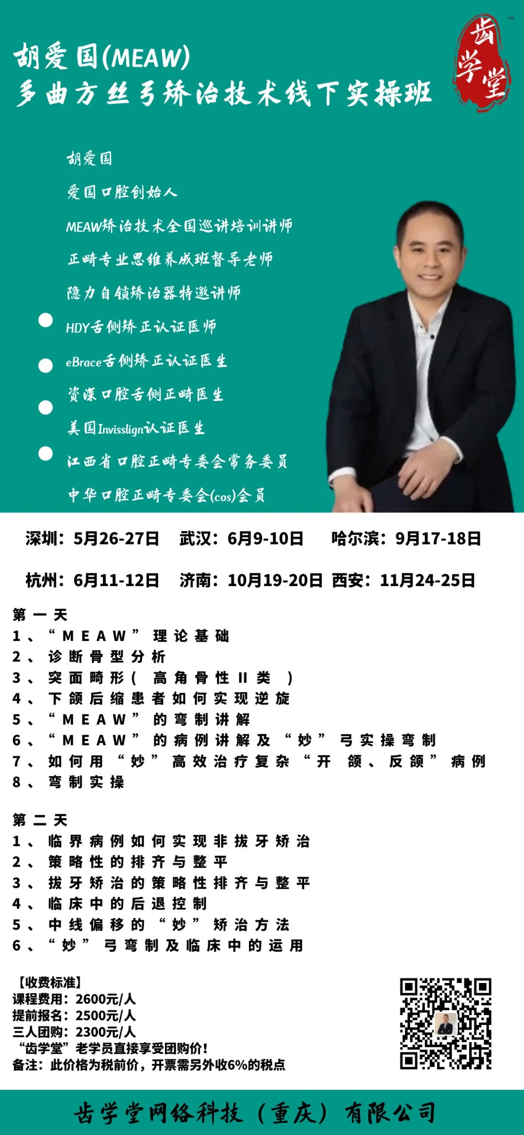 关于“MEAW”多曲方丝弓技术在临床应用中有神奇独特的疗效,被业内称为“妙”技术,世界各国都设有“MEAW研究会”或“MEAW基金会”等,传承经典,创新未来,通过对其“妙”技术培训,让我们充分了解“妙”的精髓原理,更好的为临床正畸解决疑难问题。多曲方丝弓(MEAW)技术起初是DR.Y.KIM为开合和反颌而发明,但在临床实践中,越来越多的优点被发掘应用,目前已适用于所有的错颌畸形的治疗,MEAW能做到个性化牙齿移动,直立近中倾斜牙齿,调整牙轴倾度,控制颌平面和垂直距离,建立牙齿交错的咬合关系,实现三维方向的牙齿移动等诸多优点,能够帮助我们更有效的治疗患者,若运用得当可以大大缩短治疗时间。对于一些疑难病例,如支抗丢失的再治疗,成人的偏颌治疗,反颌治疗,深覆合治疗,甚至一些“二手”病例能轻松化解,通过对MEAW的学习,希望能给大家些许灵感,把MEAW技术运用到临床,并在日常治疗过程中出现困惑时多点思路及处理方法,掌握MEAW技术精髓,干货满满,规范化指导,让您少走弯路。