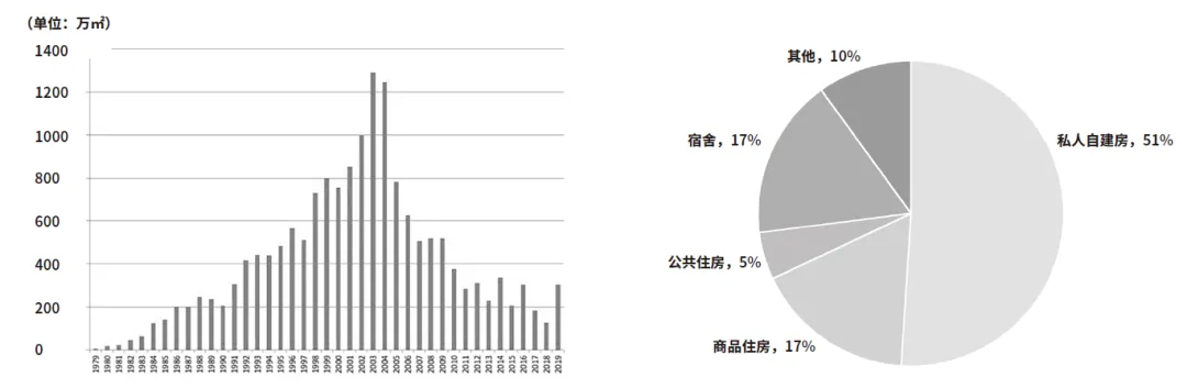 深圳住宅在40年发展历程中,居住密度不断飙升(图1、图2)。在住宅属性上,先后经历了以政府及国有企业为主导的福利住房、微利住房建设,和依托开发商大规模商品住房开发建设。与此同时,“城市包围村庄” 不断扩张,城中村大量涌现。[6]于是,以商品住房、保障性住房为主体的正规住区,与以城中村为主体的非正规住区二元化状况日趋明显。根据深圳住建局数据显示,截止2020年初,全市住房总量1 082万套,其中城中村507万套,商品住房189万套(3 595个小区),保障性住房51万套,公寓97万套,工业宿舍183万套,单位自建房55万套(图3)。