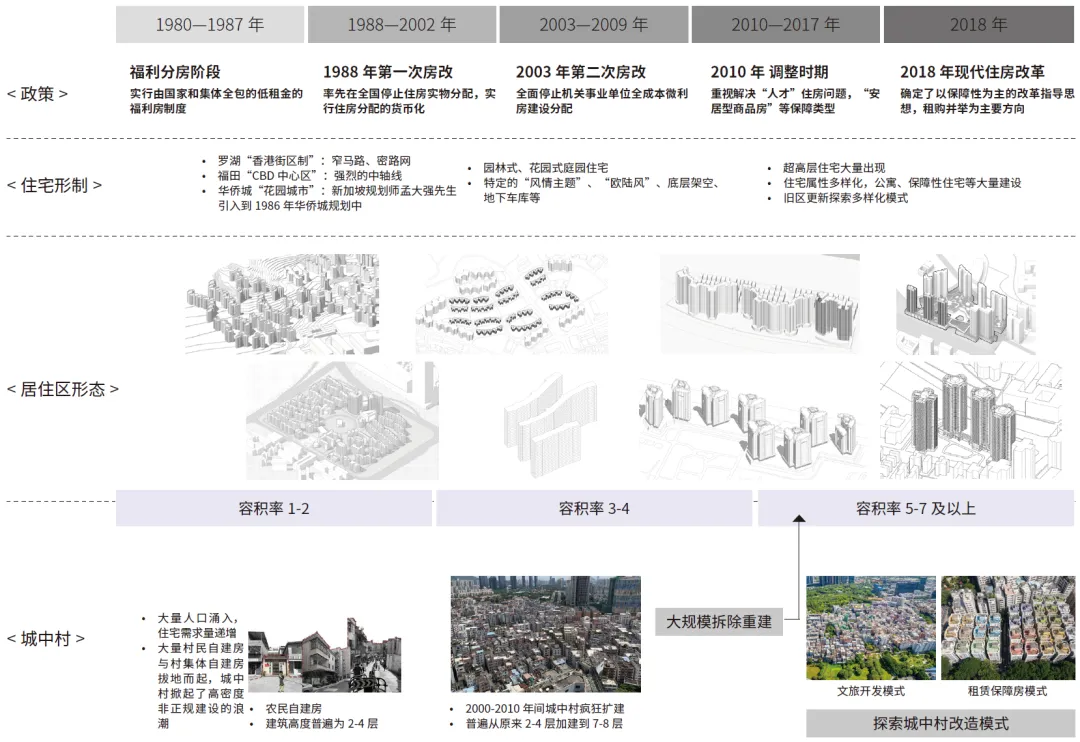 在此期间,深圳城中村掀起了高密度非正规建设的浪潮。伴随周边城市空间快速增长,村民将新村旧村原有2~4层的住宅进行增高、增容、加建和扩建,城中村住宅普遍达到4~8层,甚至达到9~18层,居住用地平均建筑覆盖率40%,其中部分用地建筑覆盖率高达90%以上,建筑密度远高于一般居住用地。全市城中村用地平均容积率达2.56,部分地块容积率突破了6.0。尽管城中村居住条件与现代都市反差巨大,但其低廉的租金、便利的生活条件使其成为外来人口在城市工作、生活、交往的重要场所,城中村原住居民与外来居民的比例达到1:35。2009年,深圳开启了城市更新运动,许多城中村被纳入城市更新范围,如大冲村、白石洲村、桂庙新村等,通过部分或整体拆除进行了商业开发。同样由于经济利益的驱动,深圳在长时间内以拆除重建作为主要的城市更新模式。2010年以后,深圳总体规划提出由“增量扩张”向“存量优化"转型,对城中村改造方针也转变为以综合整治为主。[8]近年来,逐渐出现文旅商模式(南头古城)、公共租赁住房模式(水围柠盟公寓)、点式改造(玉田村)等新的改造路径。2023年,深圳提出“城中村改造保障性租赁住房”,将对深圳市城中村进行规模化品质改造提升。