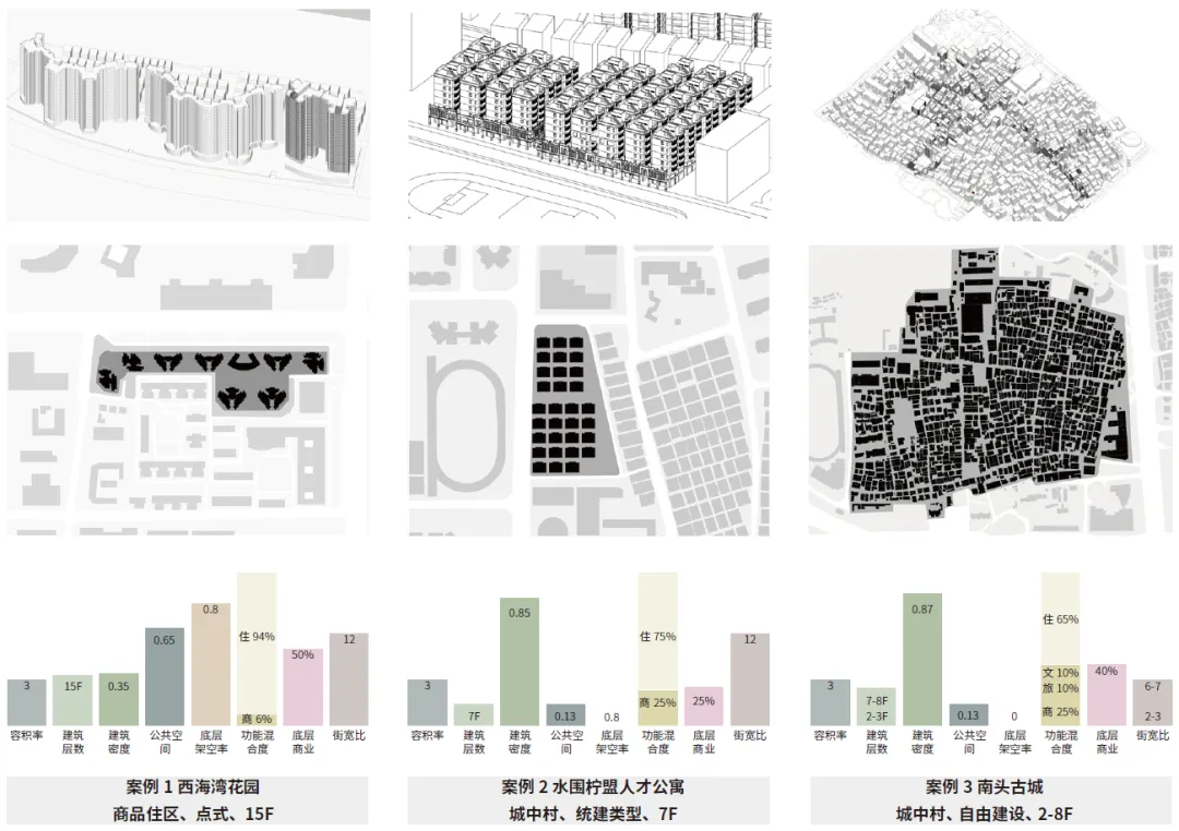 在此基础上,本文进一步选取了与南头古城容积率相近的典型商品住区案例1西海湾花园和城中村案例2水围柠盟公寓进行了对比分析(图5)。首先,从居住形态类型出发,对比其居住密度指标。基于前述对于密度指标的研究,本文居住密度指标主要包括建筑层数、建筑覆盖率、公共空间覆盖率、底层架空率、功能混合度、地上商业占比、街宽比等。其次,对上述8项居住感知进行对比分析。
