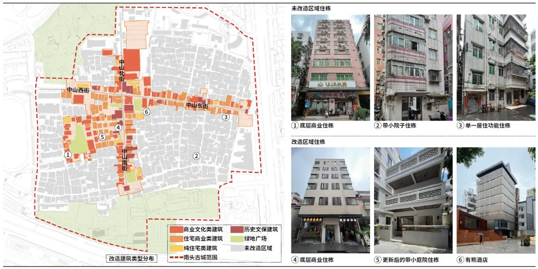 南头古城的更新改造,[12-15]以“十”字形主街的沿街区域,以及部分小广场(小绿洲)周边的住栋为主要对象。主街的改造以底层商业开发为主,整个社区中分布有90多个改造为青年公寓(泊寓)的楼栋;青年公寓改造的主要内容则包括对原有自建房建筑结构进行加固维护、平面重新分隔布局、设备管线更新、消防升级、外立面改造等;原有自建房的多种套型,均被改造成了紧凑集约的小套型;公寓管理公司以统一承租、统一更新维护、统一运营的方式进行酒店式的更新运营。由于套型配置以一室户、一室一厅为主,且套型面积较小,租金较高,对象人群发生改变,单身青年及小两口成为公寓的主要居民。泊寓主要分为两种类型:人流量较少的位置是纯居住模式,沿商业街的楼栋基本是底层商业上层居住的模式,原有住宅楼栋小院子则较多地被改造为底层商业的附属公共空间(图6)。