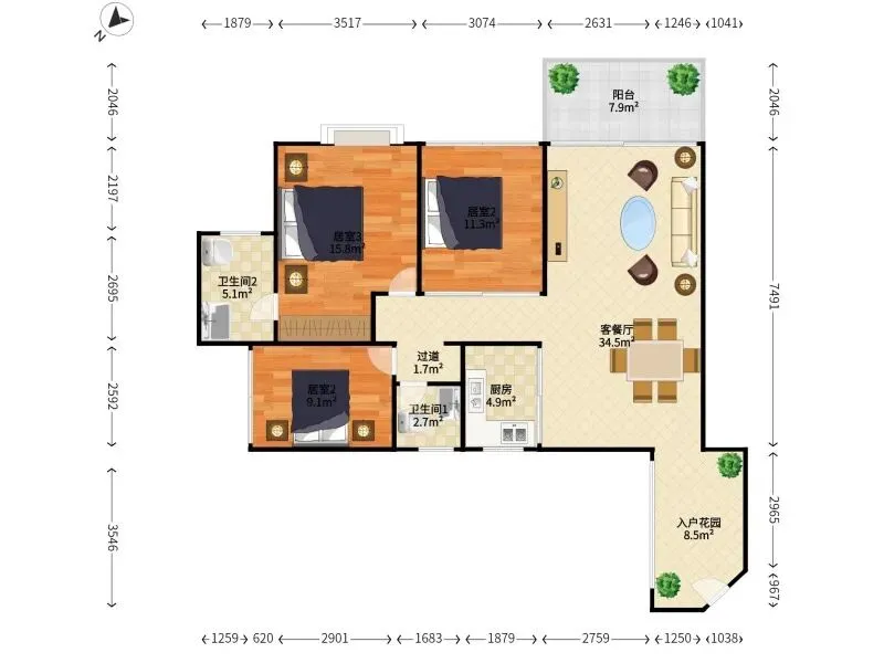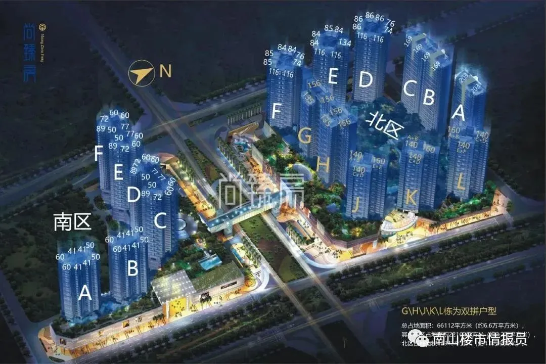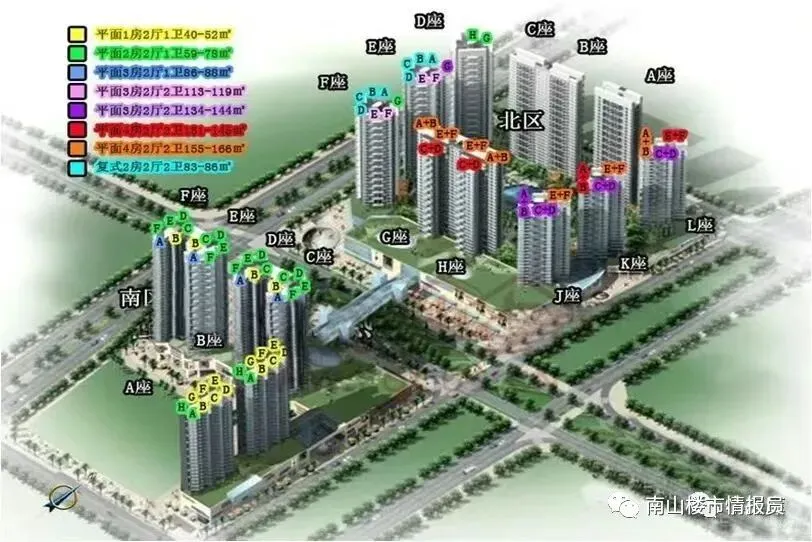 小区由17座24-32层的高层建筑组成,以工业八路分为南北两区,并由空中走廊连通。北区户型跨度大,2房-4房,最小为74平米两房,主力户型是130-170平方米3-4房,207-306平方米4-5房及顶层复式,部分为双证;南区主打小户型,主力户型是40-89平方米1-3房,为深圳湾最低门槛上车盘,全部精装修交楼。