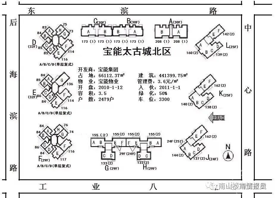 宝能太古城北区2011年入伙,小区共11栋,总共1364户,单双证均有,平层复式均有,户型从2-5房不等。小区为围合式花园大社区,底层为宝能•all city商场,地下车位3300个(含商业),北区住宅车户比1:2,未来10点后停车位可以归住宅,车位很充足。