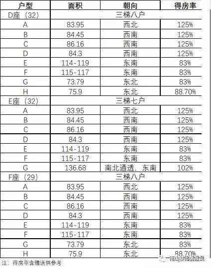 DEF栋为3梯7-8户。每栋的ABCD户型为复式,84平方左右复式可做四房,得房率将近125%,是成交热门户型。