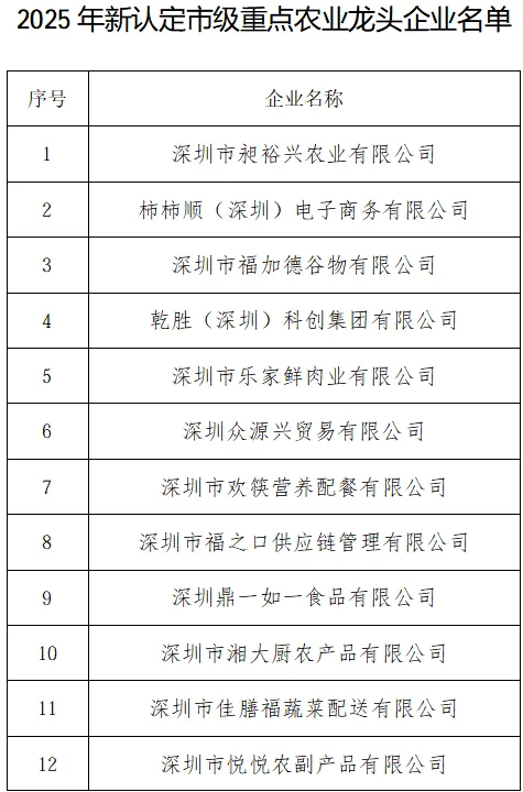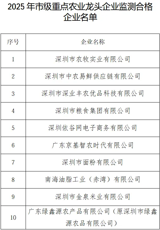 深圳市乡村振兴和协作交流局关于公布2025年新认定市级重点农业龙头企业与监测合格企业名单的通知