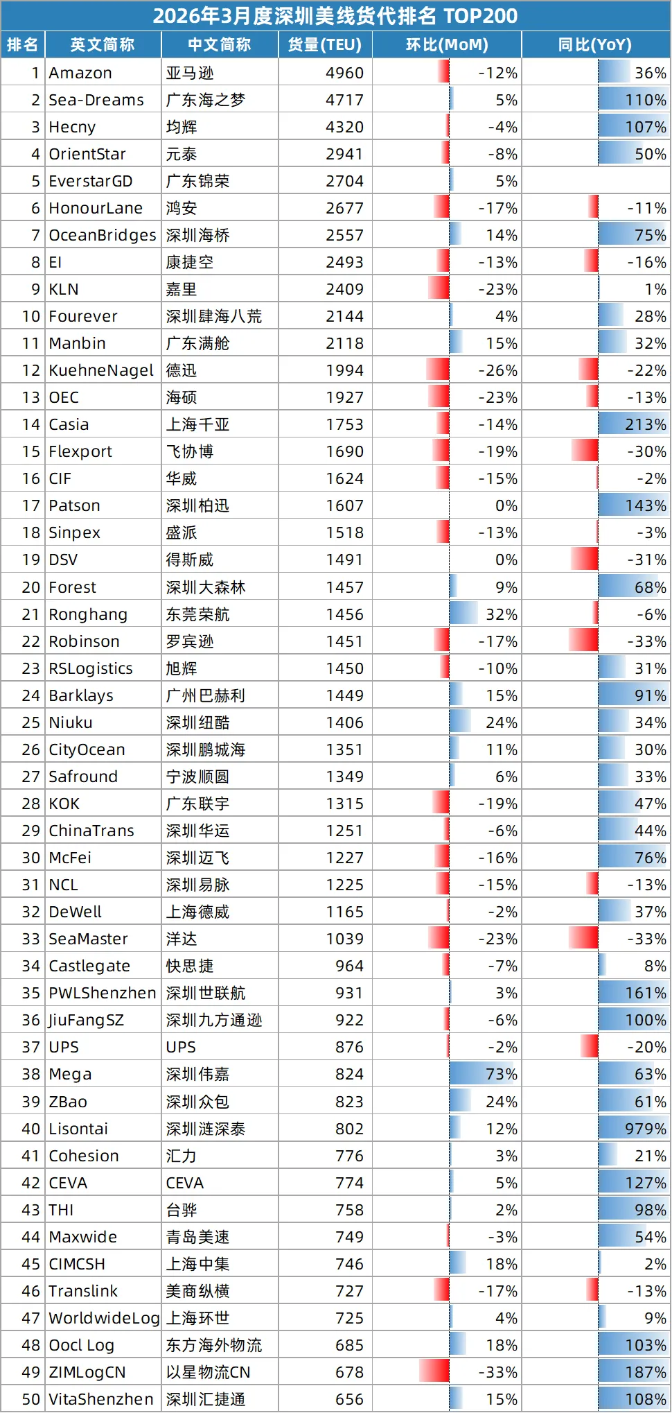 2026年3月货量同比增速突破100%的货代达49家,形成一波“倍增潮”,其中华南24家,华东12家,欧美10家,港台3家。